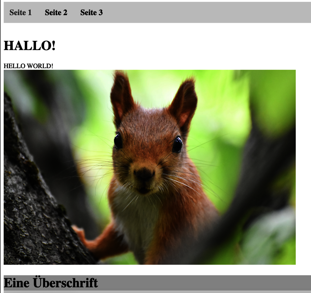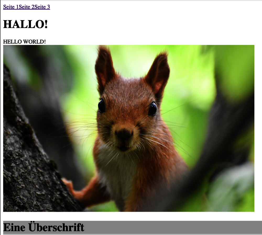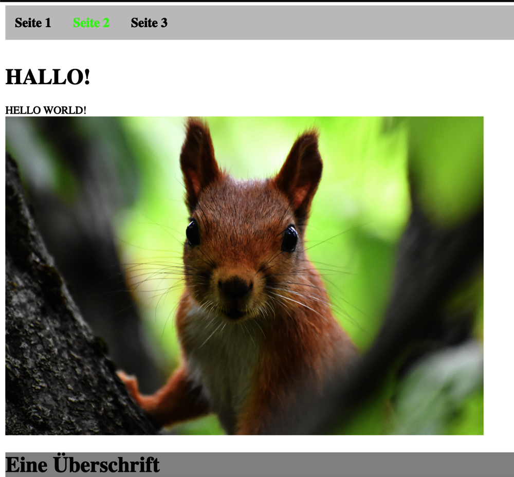 Mit “CUR = 1” wird ausgedrückt, dass ein “Current-Status” existiert. Das geschieht bei NO (und nur bei NO) automatisch mit, indem NO irgendetwas zugewiesen wird. CUR und andere TMENU Item States müssen zuerst aktiviert, also auf 1 gesetzt werden. Der Rest funktioniert analog zum NO-Attribut. So sieht unser Frontend aus, wenn “Seite 2” die aktive ist: